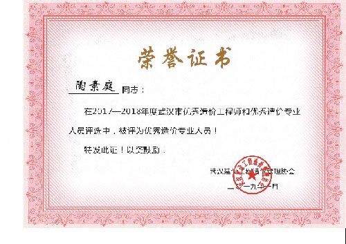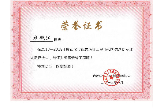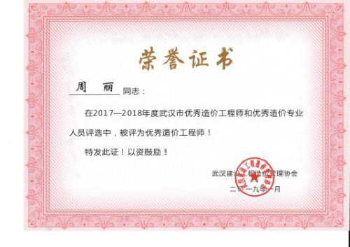 與時(shí)俱進(jìn)、開拓進(jìn)取——熱烈祝賀我司周麗等6名同志榮獲“2017-2018年度武漢市優(yōu)秀造價(jià)工程師和優(yōu)秀造價(jià)專業(yè)人員”